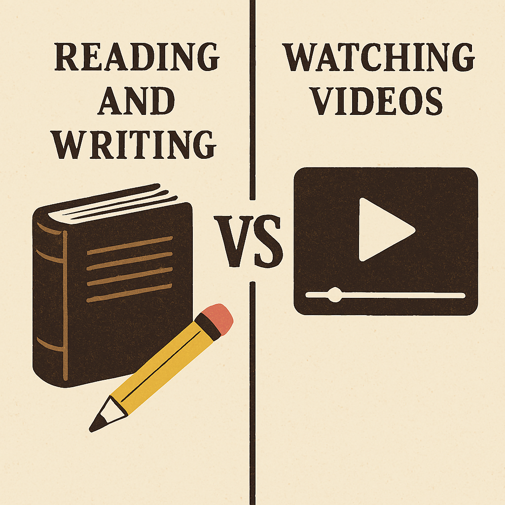 Studies show that reading and writing improve memory retention far more than watching. Videos may entertain, but words embed themselves into your thinking.